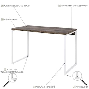 Sobre o ProdutoMesa Kuadra Office 120X60X75cm Amadeirado / Est.BrancaDescrição do Produto:A Mesa Office KUME6120 tem montagem simples e versátil, podendo ser utilizada em diversas composições com outros mó Linha Kuadra tem seu design com inspiração no estilo industrial, que remete muito a decoração usada nos Lofts das grandes metrópoles nos anos 60 e 70. Harmonizando o metal e os tons de madeira, foram projetados móveis versáteis e com estilo, que podem compor ambientes íveis cheios de personalidade, perfeitos para você decorar sua casa ou seu trabalho, tendo um resultado que caminha do estilo rústico ao Inclusos:1 MesaDimensões dos Produtos:Mesa Kuadra Office 120X60X75cm Amadeirado / 120 x 60 x 75 cmInformações Logísticas (Comp. X Prof. X Alt.) 140 x 64,5 x 7 cm - Peso: 15,254 KgPeso Total: 15,254 KgObservações:Não acompanha acessórios decorativos. Imagens meramente ilustrativas.Informações Técnicas / Características:- Cor do Produto: Amadeirado / Cor do Predominante: Branco- Marca: Compace- Modelo: KUME6120- Linha: Kuadra- Material: Mdp- Material da Estrutura / Pés: Aço- Acabamento: BP Acetinado- Escala de Brilho: Fosco- Fita de Borda: Pvc - Possui Gavetas: Não - Possui Pés: 2- Pés Niveladores: Sim - Acabamento Estrutura: Epóxi-Pó Texturizado- Formato: Retangular - Suporta Até (kg): 30 kg- Comprimento: 120cm- Profundidade: 60cm- Altura: 75cm - Peso Lí.: 14,32Kg- Recomendações de Uso, Manutenção e Limpeza: Para a limpeza, utilize flanela seca ou pano macio levemente umedecido em água. Utilize um pano seco em seguida. Evite com produtos químicos e não utilize nenhum tipo de esponja de aço.- Necessita de Montagem: Sim / Acompanha Manual de Montagem- Complexidade da Montagem: Média- Garantia: 6 meses
