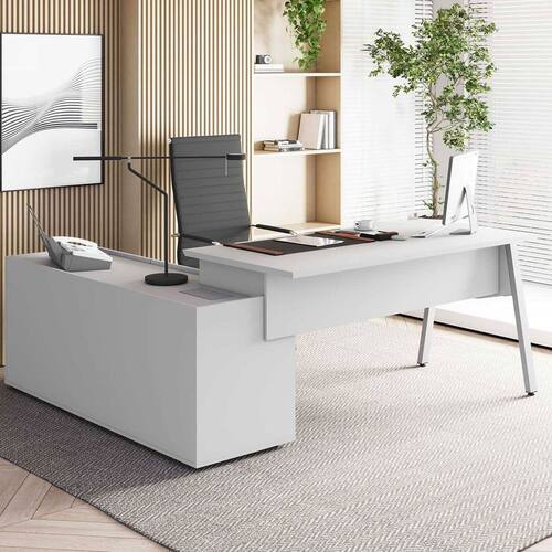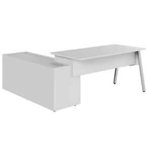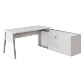 Mesa em L funcional e moderna, ideal para escritórios e home offices. Possui tampo cavado que garante ergonomia e armário lateral para organização, oferecendo amplo espaço e praticidade no dia a dia.