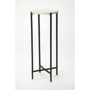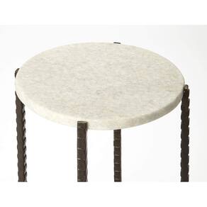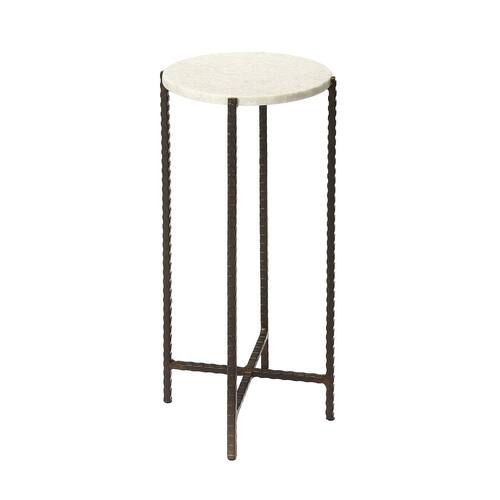 Mesa discreta de metal e mármore. Use-o para colocar bebidas ao lado de uma cadeira ou coloque-o perto de uma janela com uma planta. As pernas torcidas de ferro suportam uma placa de mármore branca lisa. Esta mesa é funcional e permite suas necessidades; em estilo e espaço. Use-o em pares como pequenas mesas de canto flanqueando seu sofá moderno, ou coloque-o na entrada com uma cesta para pegar suas chaves.