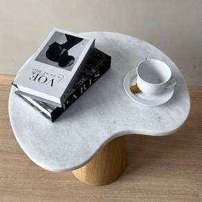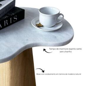 Seu formato orgânico traz fluidez e harmonia aos espaços, enquanto a combinação do Mármore Espirito Santo com a base em madeira garante um visual sofisticado e versátil, fácil de combinar com diferentes estilos de decoração.