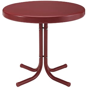 - RETRO THROWBACK: esta mesa lateral de pátio externo dá vida ao charme vintage com seu acabamento acetinado vermelho escuro e base de pedestal clássica.