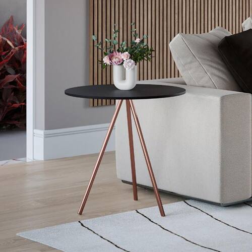 Mesa Lateral Gabriela Wood Tampo Madeira Preto Pés Cobre Que tal a Mesa Lateral Gabriela Tampo Madeira? Se você é daqueles que acredita que a beleza está nos detalhes, vai adorar a Mesa Lateral Gabriela. Esta peça cheia de estilo vai dar o toque especial que todo espaço precisa, além de trazê-lo a um patamar de design que vai valorizar todo o ambiente. Versátil, ela fica perfeita em qualquer cômodo e ainda ajuda na organização. Uma verdadeira peça curinga!