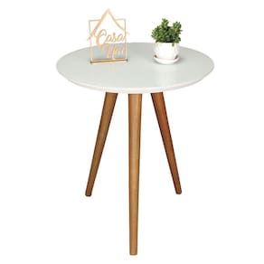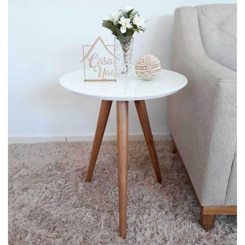 Mesa De Canto Lateral Pés Palito Branca com Vidro 50 cm Diâmetro 60 cm Altura Casa Uai FOTO REAL do produto, tirada em nosso estúdio.