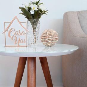 Medidas • Altura: 60 cm • Diâmetro tampo: 50 cm • Cor: Branca com Vidro • Pés palito: Madeira
