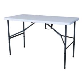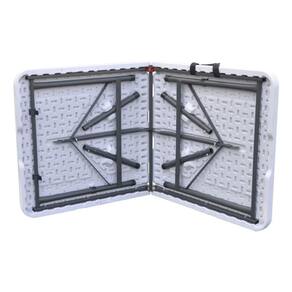 Resumo das caracteristicas e especificacoes: Mesa Dobravel, Tonalidade Branco e Cinza, Formato Retangular, 4 lugares, Altura 74,00 cm, Largura 61,50 cm, Comprimento 124,00 cm, Material do Tampo Plastico, Estrutura de Metal, Tipo de Material da Estrutura Aco e Resina, Dobravel, Estilo Atemporal, Nao Giratoria, Nao Extensivel, Indicada para Externas com Cobertura, Montada, Garantia do Fabricante 3 meses, Nao indicada para regioes com maresia e/ou contato direto com agua.