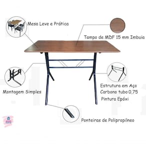 Características: Tampo de madeira em MDF 15mm Base em aço com pintura epóxi Compacta Leve Resistente e durável Pode ficar exposta ao sol Feita em madeira com tratamento anti umidade Fica bem em ambientes internos e externos Praticidade na limpeza e manutenção Processo de montagem simples