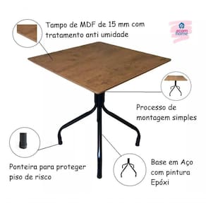 Características: Tampo de madeira em MDF 15mm Base em aço com pintura epóxi Compacta Leve Resistente e durável Pode ficar exposta ao sol Feita em madeira com tratamento anti umidade Fica bem em ambientes internos e externos Praticidade na limpeza e manutenção Processo de montagem simples