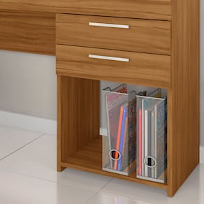 Sua estrutura bem planejada inclui tampo amplo, uma gaveta com corrediças metálicas e nicho lateral que facilita o armazenamento de itens como livros, materiais de escritório ou até mesmo a CPU.