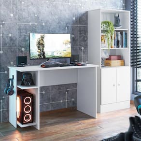 Possui uma prateleira elevada para o CPU e suporte para fone de ouvido ou bolsa, pensados para a praticidade do dia.