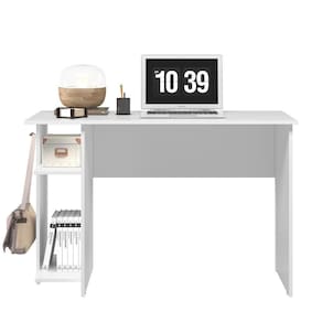 Possui uma prateleira elevada para o CPU e suporte para fone de ouvido ou bolsa, pensados para a praticidade do dia.