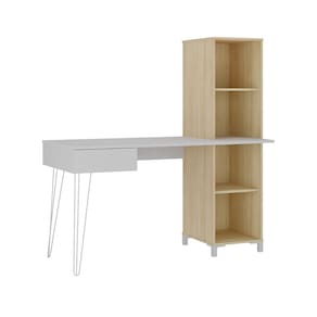 Ela é indicada para Escritórios, Salas de Estar ou Quartos. Ela possui tampo de 18mm com borda ABS de 2mm. Possui também uma gaveta com corrediça telescópica, duas prateleiras com regulagem de altura.