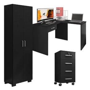 Mesa para computador com Gaveta e Extensora e Gaveteiro Gávea com Chave e Livreiro Office Portas Grandes Preto Fosco - Móveis Leão