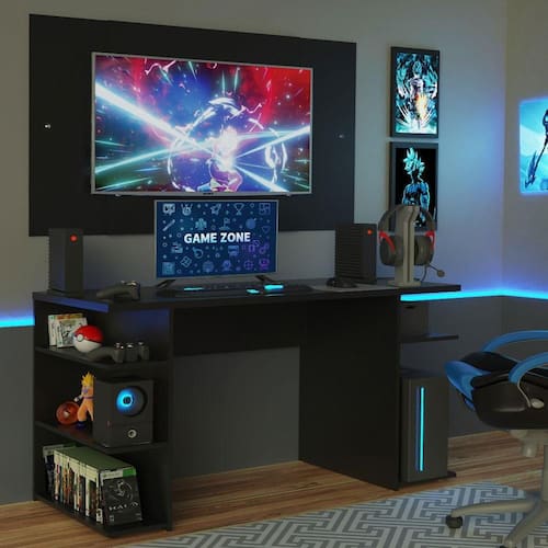 A mesa para PC e videogame possui design moderno e comporta perfeitamente todos os acessórios, com espaço amplo no tampo, além de diversas prateleiras nas laterais.