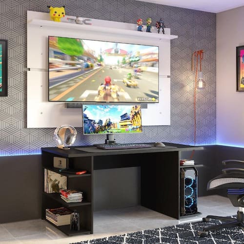 A mesa para PC e videogame possui design moderno e comporta perfeitamente todos os acessórios, com espaço amplo no tampo, além de diversas prateleiras nas laterais.