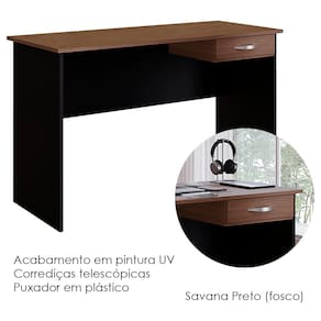 Mesa para escritório 6901, ideal para compor ambientes compactos com modernidade. Produzida em MDP (15 mm) com acabamento em pintura UV. Conta com gaveta com corrediças telescópicas, puxador e sapatas em plástico. Não acompanha eletrônicos. Este produto será entregue em 01 volume.