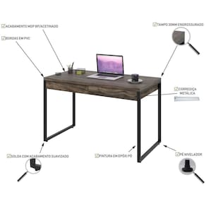 A Mesa Office KUME6122 tem montagem simples e versátil, conta com 02 gavetas embutidas e pode ser utilizada em diversas composições com outros móveis. A Linha Kuadra tem seu design com inspiração no estilo industrial, que remete muito a decoração usada nos Lofts das grandes metrópoles nos anos 60 e 70. Harmonizando o metal e os tons de madeira, foram projetados móveis versáteis e com estilo, que podem compor ambientes flexíveis cheios de personalidade, perfeitos para você decorar sua casa ou seu trabalho, tendo um resultado que caminha do estilo rústico ao moderno. Acabamento da Gaveta: BP Acabamento da Porta: Acabamento da Prateleira: Acabamento dos Pés: Altura dos Pés: Ambiente Principal: Escritório Complexidade da Montagem: Média: pode ser montado por mais de uma pessoa e/ou necessite de maior conhecimento para montagem Cor: Carvalho Dark Cor do Produto: Carvalho Dark Cor Flex: Cor Interna: Carvalho Dark Escala de Brilho: Fosco Escala de Brilho da Gaveta: Fosco Escala de Brilho da Porta: Escala de Brilho da Prateleira: Formato: Retangular Gaveta com Chave: Não Informações Complementares: Itens Inclusos: 1 Mesa e Manual de Montagem Largura Frontal: Largura Lateral: Linha ou Coleção: Kuadra Manual de Especificação Técnica: Manual de Montagem e Instalação: https://cdn2.madeiramadeira.com.br/atributo/compace-dalex/839693-mesa-kuadra.pdf Material da Gaveta: MDP Material da Porta: Material da Prateleira: Material do Puxador da Gaveta: Material do Puxador da Porta: Material dos Pés: Aço Material Principal: MDP Montagem Flex: Necessita Montagem: Sim Origem do Produto: Nacional Pés Reguláveis: Peso: 21,94 Peso Máximo por Gaveta: 05 Peso Máximo por Prateleira: Possui Passa Cabos: Não Possui Pés: 02 Possui Porta Objetos: Não Possui Portas: Não Possui Prateleiras: Não Possui suporte para CPU: Não Possui Suporte para Teclado: Não Quantidade de Nichos: Recomendações de Uso, Manutenção e Limpeza: Para a limpeza, utilize flanela seca ou pano macio levemente umedecido em água. Utilize um pano seco em seguida. Evite contato com produtos químicos (solventes, thinner, acetona, etc) e não utilize nenhum tipo de esponja de aço. Rodízio com Trava: Sapatas Niveladoras: Sim Sistema de Montagem: Parafusos Suporta Até (kg): 40 Tipo de Corrediça da Gaveta: Metálica Simples Tipo de Dobradiça/Corrediça da Porta: Tipo de Madeira Maciça: Tipo de Madeira Maciça da Gaveta: Tipo de Madeira Maciça da Porta: Tipo de Madeira Maciça da Prateleira: Tipo de Madeira Maciça do Puxador da Gaveta: Tipo de Madeira Maciça do Puxador da Porta: Tipo de Madeira Maciça dos Pés: Tipo de Puxador da Gaveta: Embutido Tipo de Puxador da Porta: