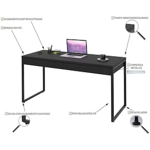 A Mesa Diretor KUME6152 tem montagem simples e versátil, conta com 02 gavetas embutidas e pode ser utilizada em diversas composições com outros móveis. A Linha Kuadra tem seu design com inspiração no estilo industrial, que remete muito a decoração usada nos Lofts das grandes metrópoles nos anos 60 e 70. Harmonizando o metal e os tons de madeira, foram projetados móveis versáteis e com estilo, que podem compor ambientes flexíveis cheios de personalidade, perfeitos para você decorar sua casa ou seu trabalho, tendo um resultado que caminha do estilo rústico ao moderno. Acabamento: BP Acabamento da Gaveta: BP Acabamento da Porta: Acabamento da Prateleira: Acabamento dos Pés: Altura: 75 Altura dos Pés: Ambiente Principal: Escritório Complexidade da Montagem: Média: pode ser montado por mais de uma pessoa e/ou necessite de maior conhecimento para montagem Cr: Preto Ônix Cr do Produto: Preto Ônix Cr Flex: Cr Interna: Preto Ônix Escala de Brilho: Fosco Escala de Brilho da Gaveta: Fosco Escala de Brilho da Porta: Escala de Brilho da Prateleira: Estilo: Industrial Formato: Retangular Gaveta com Chave: Não Informações Complementares: Itens Inclusos: 1 Mesa e Manual de Montagem Largura: 150 Largura Frontal: Largura Lateral: Linha ou Coleção: Kuadra Manual de Especificação Técnica: Manual de Montagem e Instalação: https://cdn2.madeiramadeira.com.br/atributo/compace-dalex/839673-mesa-kuadra.pdf Material da Gaveta: MDP Material da Porta: Material da Prateleira: Material do Puxador da Gaveta: Material do Puxador da Porta: Material dos Pés: Aço Material Principal: MDP Montagem Flex: Necessita Montagem: Sim Origem do Produto: Nacional Pés Reguláveis: Peso: 25,11 Peso Máximo por Gaveta: 05 Peso Máximo por Prateleira: Possui Gavetas: 02 Possui Passa Cabos: Não Possui Pés: 02 Possui Porta Objetos: Não Possui Portas: Não Possui Prateleiras: Não Possui Rodízio: Não Possui suporte para CPU: Não Possui Suporte para Teclado: Não Profundidade: 60 Quantidade de Nichos: Recomendações de Uso, Manutenção e Limpeza: Para a limpeza, utilize flanela seca ou pano macio levemente umedecido em água. Utilize um pano seco em seguida. Evite contato com produtos químicos (solventes, thinner, acetona, etc) e não utilize nenhum tipo de esponja de aço. Rodízio com Trava: Sapatas Niveladoras: Sim Sistema de Montagem: Parafusos Suporta Até (kg): 40 Tamanho: Tipo de Corrediça da Gaveta: Metálica Simples Tipo de Dobradiça/Corrediça da Porta: Tipo de Madeira Maciça: Tipo de Madeira Maciça da Gaveta: Tipo de Madeira Maciça da Porta: Tipo de Madeira Maciça da Prateleira: Tipo de Madeira Maciça do Puxador da Gaveta: Tipo de Madeira Maciça do Puxador da Porta: Tipo de Madeira Maciça dos Pés: Tipo de Puxador da Gaveta: Embutido Tipo de Puxador da Porta: