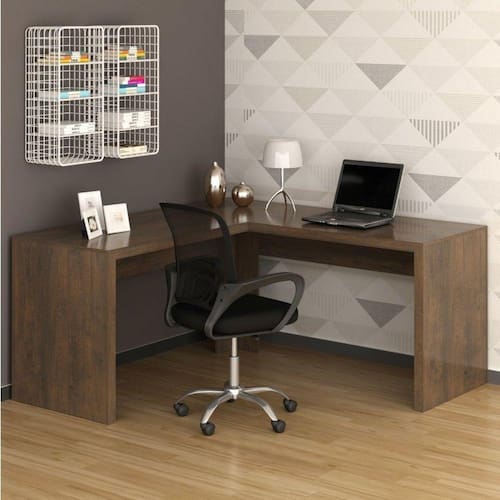 Mesa Escritório angular Tecnomobili ME4116, não possui gavetas mas tem um amplo espaço para trabalhar, colocar material, mantendo seu escritório organizado, material em MDP, acabamento em BP, costas na cor do móvel.