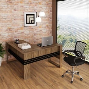 A cadeira tem estrutura em poliuretano de altíssima qualidade, que proporciona muito mais resistência, mesmo com o passar dos anos. O acabamento em verniz deixa o móvel mais bonito e dá mais destaque a decoração de toda a casa. Essa cadeira tem design versátil, assento confortável e vem com kit de montagem, para tudo ficar mais rápido e prático. Ela suporta até 120 kg de peso máximo, que dá mais tranquilidade ao sentar e tem 4 pés com rodízios em PU que não arranham o piso do cômodo. Acabamento: Finish Foil Altura do Conjunto: 85 cm Ambiente: null Ambiente Principal: Escritório Cor: Nogal/Preto Informação Complementar: 1x Mesa para Escritório em L Charme Nogal/Preto Largura: 136 cm Altura: 74 cm Peso: 42,7 kg Profundidade: 60 cm Necessita Montagem: Sim