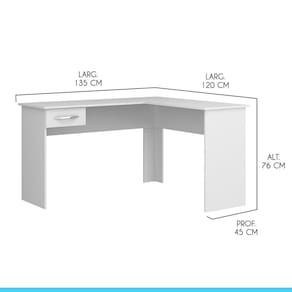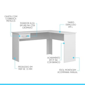 A Mesa Escrivaninha é um móvel útil e versátil que promete ser o protagonista do seu ambiente. Dispõe de um design atual que facilita na hora de montar a decoração, proporcionando um espaço mais aconchegante e organizado. Possui tampo espaçoso em formato de L e uma gaveta para armazenar seu material de uso diário. A mesa escrivaninha é produzido com materiais de excelente qualidade, garantindo a sua durabilidade.