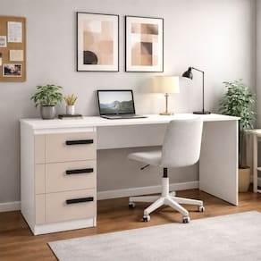 O(a) Mesa para Escritório Lisboa 3 Gavetas Creme/Branco - Politorno é produzido em MDP na escala de brilho Semi-Fosco, e possui um grau de dificuldade de montagem: Médio.