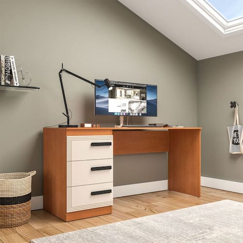 O(a) Mesa para Escritório Valência 3 Gavetas Creme/Freijó - Politorno é produzido em MDP na escala de brilho Semi-Fosco, e possui um grau de dificuldade de montagem: Médio.