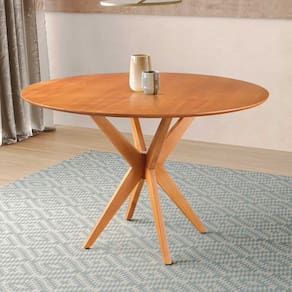 A Mesa Serena combina elegância e funcionalidade em um design atemporal. Seu tampo redondo em madeira natural traz aconchego ao ambiente, enquanto a base escultural, composta por quatro pés cruzados, adiciona um toque de modernidade e leveza visual.