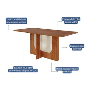 A base da Mesa Louise é uma obra de arte por si só. Feita de MDF, proporciona estabilidade excepcional, enquanto o detalhe em tela sintética adiciona um elemento de textura e elegância. O tampo de MDF laminado confere um toque de modernidade e leveza. Cada aspecto da Mesa Louise foi projetado com cuidado, desde a escolha dos materiais até os detalhes finos. Os contornos suaves, a combinação de texturas e a atenção aos acabamentos fazem desta mesa uma declaração de estilo que não passa despercebida. Acabamento: Pintura UV Acabamento da Base: Pintura UV Ambiente Principal: Sala de Jantar codigo_ean: 7909903824160 Complexidade da Montagem: Média: pode ser montado por mais de uma pessoa e/ou necessite de maior conhecimento para montagem Cor: Cinamomo Cor do Produto: Cinamomo Dobrável: Não Escala de Brilho: Semi-Brilho Extensível: Não Itens Inclusos: 1 Mesa, Manual de montagem e Kit de ferragens Manual de Montagem e Instalação: https://product-hub-prd.madeiramadeira.com.br/922411/documents/817efc03-d23e-4cb7-ae8a-ba3f19e98e182161949503517217385583954.pdf Material da Base: MDF Material do Tampo: MDF Material Principal: MDF Medida do Tampo (L x C x E): 90 x 180 x 2,5 Necessita Montagem: Sim Origem do Produto: Nacional Peso: 47,5 kg Possui Rodízio: Não Possui Vidro: Não Recomendações de Uso, Manutenção e Limpeza: Para manter seu móvel novo por muito mais tempo, evite locais úmidos, mantenha-o distante de líquidos. Para limpá-lo com segurança utilize uma flanela seca sem produtos abrasivos Sistema de Montagem: Para manter seu móvel novo por muito mais tempo, evite locais úmidos, mantenha-o distante de líquidos. Para limpá-lo com segurança utilize uma flanela seca sem produtos abrasivos Suporta Até (kg): 40 kg