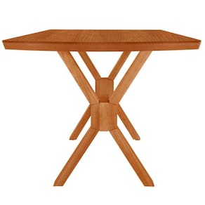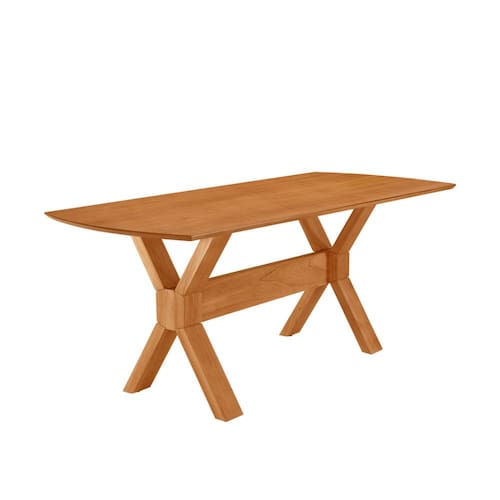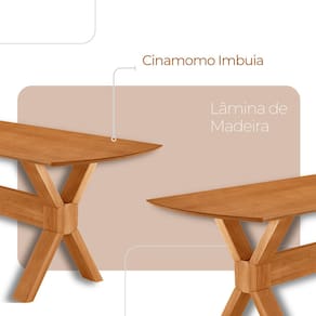 A estrutura em laminado de madeira cinamomo acrescenta aconchego e naturalidade ao design, formando um contraste equilibrado com o tampo laqueado. O destaque fica por conta do imponente detalhe em X na base, que confere identidade marcante, estabilidade e um visual arquitetônico à peça.