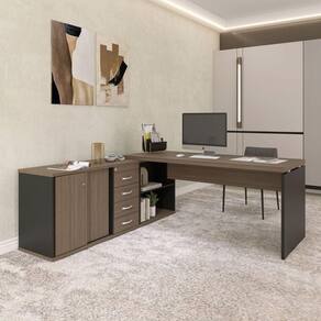 Mesa Pé Balcão Escritório Com 4 Gavetas 189x180cm Preto/walnut Mesa Pé Balcão Escritório com 4 gavetas 189x180cm Preto/Walnut - A Mesa Pé Balcão para Escritório com 4 Gavetas 189x180 cm é a escolha ideal para quem busca praticidade, organização e um design moderno para o ambiente de trabalho. Com amplo espaço para acomodar computador, documentos e materiais de uso diário, oferece maior conforto e funcionalidade. Suas 3 gavetas proporcionam organização eficiente para papéis e objetos pessoais, enquanto a estrutura resistente garante durabilidade e . Perfeita para escritórios, home offices e ambientes corporativos que exigem produtividade e estilo.