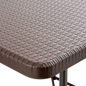 Resumo das caracteristicas: Tipo: Mesa Dobravel Tipo Maleta Estampa: Rattan Cor: Marrom Comprimento: 180 cm Marca: Klimber Material: Polietileno de alta densidade e aco Uso recomendado: Interno e externo Sistema dobravel tipo maleta para facil transporte e armazenamento. Superficie ampla e resistente. Facil de limpar e manter. Montagem e desmontagem rapidas. Ideal para eventos, lazer e uso domestico. Marca: Não Informado