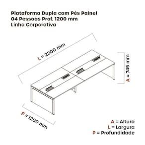 A Mesa Plataforma Para Coworking para 4 pessoas é uma ótima opção para quem busca um ambiente de trabalho moderno, funcional e confortável. Essa mesa possui uma estrutura de aço resistente e elegante, com espaço para a instalação de tomadas e conectores. Além disso, é permitindo adequar com mais plataformas para criar uma interação dinâmica e colaborativa, transfonando seu espaço de trabalho produtivo, criativo e agradável. Produto Montado: Sim Acabamento dos Pés: Polipropileno Acompanha Manual de Instalação: Sim Ambiente Principal: Escritório codigo_ean: 7909903585764 Complexidade da Montagem: Alta: deve ser montado por um montador especializado Cor: Preto/Branco Cor do Produto: Preto/Branco Cor Interna: Preto/Branco Escala de Brilho: Semi-Fosco Espessura do Tampo: 25 mm Itens Inclusos: 1 Mesa plataforma para 4 lugares Linha ou Coleção: Linha Corporativa Manual de Montagem e Instalação: https://product-hub-prd.madeiramadeira.com.br/893786/documents/4eb84744-7623-4858-954a-70d73fa3746620Dupla200420PC3A920Painel.pdf Material dos Pés: Polipropileno Material Principal: MDP Necessita Montagem: Sim Origem do Produto: Nacional Pés com Regulagem de Altura: Sim Pés Reguláveis: Sim Peso: 74,2134 kg Recomendações de Uso, Manutenção e Limpeza: Utilize pano úmido com para limpeza Sapatas Niveladoras: Sim Sistema de Montagem: Pasrafuso