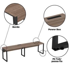 A mesa oferece amplo espaço para computadores, materiais de trabalho e reuniões rápidas. Seu design funcional permite integração com cadeiras e acessórios de escritório, promovendo um ambiente produtivo e organizado.