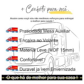 Mesa portátil de volante auxiliar para caminhão Crie inove e encante A nossa linha de moveis não para de crescer e agora traz para você, esta linda peça para te auxiliar. Esta peça com certeza vai te proporcionar melhor conforto. Mesa portátil de volante auxiliar para caminhão :::especificações técnica::: : características: - marca: eco.Start - dimensões: - altura 40 cm - comprimento 60 cm - espessura: 15 mm - peso 2 kg - material: mdf medium density fiberboard - mdf ecologicamente correto com certificado fsc de alta qualidade - nível de instalação: fácil; - de 90 dias contra defeitos de fabricação; Marca: Não Informado
