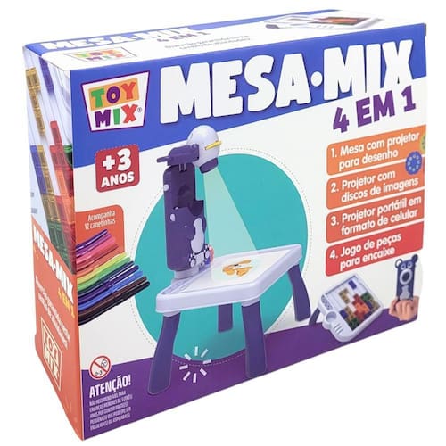Essa mesa projetora infantil 4 em 1 modelo 0-336.34.99 da Toymix é garantia de diversão para a criançada, pois oferece 4 funções em apenas um brinquedo, podendo ser usada como mesa de desenho infantil com projetor, projetor infantil, como lanterna e para jogar tetris.Essa mesinha de brinquedo mede montada aproximadamente 29cm de altura, 21cm de comprimento e 19cm de largura, é feita toda em plástico, não emite som.Conteúdo da embalagem: 1 Mesa Projetora Infantil, 1 Projetor Portátil, 12 Canetinhas Coloridas, 1 Película Para Desenho, 1 Mini Apagador, 1 Suporte Para o Projetor, 1 Cordão Para Segurar o Projetor, 6 Discos De Projeção E 1 Jogo Tetris. Certificado de Segurança: INMETRO CE-BRI/BRICS 00163-15 NM300/2002.