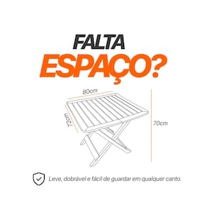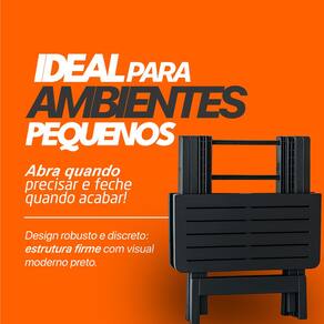 Dimensões: 80 cm de comprimento x 72 cm de largura x 70 cm de altura Estrutura dobrável, fácil de transportar e guardar Tampo em plástico resistente, cor preta, fácil de limpar Estrutura metálica reforçada para maior durabilidade e estabilidade Uso versátil: ideal para refeições, eventos, apoio ou trabalho Acabamento discreto e elegante que combina com diversos ambientes