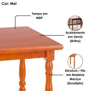 Design clássico e imponente definem a Mesa 105LB, alinhando qualidade e durabilidade para seu lar! Com estrutura/ pés em Madeira Maciça (Eucalipto), Tampo Laminado MDP revestido de lâmina de madeira com espessura 2,3 cm (bordas revestidas de 3 cm) e acabamento em Verniz brilho. Acomoda até 4 cadeiras (não inclusas) e suporta até 30 kg (tampo). Destaque para os pés torneados (6,2 cm) com detalhes atemporais. NÃO ACOMPANHA CADEIRAS NEM DEMAIS DECORAÇÕES. Este produto será entregue em 2 volumes.