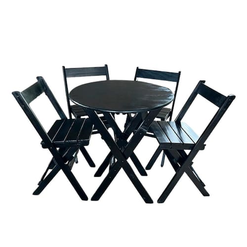 Características Tipo: Conjunto Mesa e Cadeiras Modelo: Redonda Dobrável Cor: Preto Estrutura em madeira resistente Acabamento natural e visual rústico Uso em ambientes internos ou externos cobertos