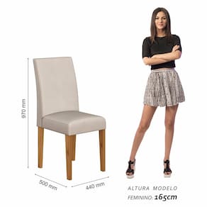 Detalhes Técnicos das Cadeiras: - Acabamento da Cadeira: Pintura com Assento e Encosto Tapeçados - Almofada do Assento: Fixa - Cadeira Estofada: Sim - Peso Suportado da Cadeira: 90 KG - Facilidade da Montagem: Média - Tonalidade da estrutura da Cadeira: Cinamomo - Tonalidade do Tecido: Suede Bege - Espuma do Assento: D 23 - Espuma do Encosto: D 16 - Tipo de Pintura: UV Texturizada - Material da Estrutura: 100% MDF 25 e 18 mm - Medida da Cadeira/ Banco: 97CM x 44CM x 50CM