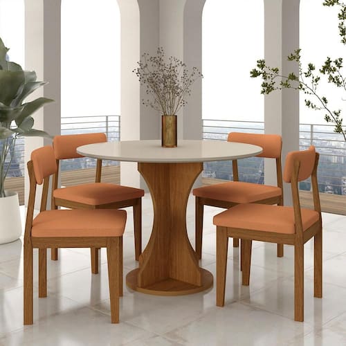Detalhes Técnicos das Cadeiras Assento e Encosto Tapeçados/Estofados Peso Suportado da Cadeira:90KG Tonalidade da Cadeira:Freijó/Suede Terracota Borda PU Espuma do Assento/Encosto:D16 Tipo de Pintura:UV Texturizada Material da Estrutura:MDF 25/18mm Medida da Cadeira:A:83xL:46xP:53CM Altura do chão até o assento 49,5CM