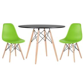 CADEIRAS: Material do assento: Polipropileno - Material da base: Madeira e aço - Altura do encosto: 81 cm - Altura do assento: 43 cm - Largura do assento: 46 cm - Profundidade do assento: 40 cm - Distância entre os pés: 40 cm - Peso suportado: 130 kg. MESA: Material do tampo: MDF laqueado (Laca fosca) - Material da base: Madeira e aço - Altura: 75 cm - Diâmetro: 100 cm.
