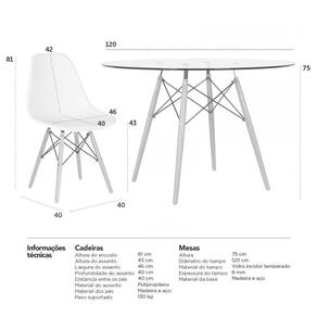 Altura: 75 cm | Cor: Multicolorido | Garantia do fabricante: 3 meses | Largura: 120 cm | Peso do produto: 20 kg | Produto: Conjunto de Mesa e Cadeiras | Quantidade de lugares: 5 | Material do tampo (mesa): Vidro incolor temperado 8 mm | Material da base (mesa): Madeira e aço | Altura (mesa): 75 cm | Diâmetro (mesa): 120 cm | Material do assento (cadeiras): Polipropileno | Material da base (cadeiras): Madeira e aço | Altura do assento (cadeiras): 43 cm | Largura do assento (cadeiras): 46 cm | Profundidade do assento (cadeiras): 40 cm | Fabricante: Mobili | RBN: 17100657011