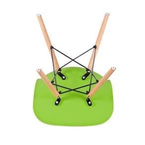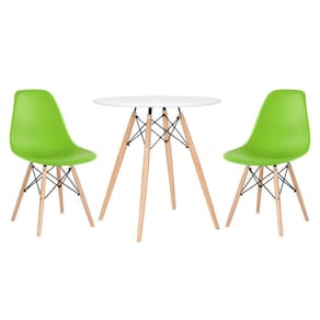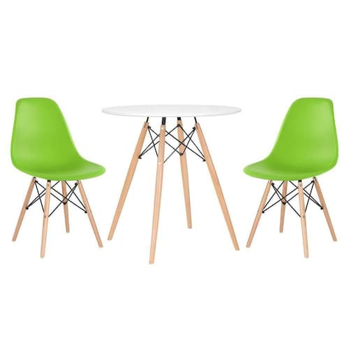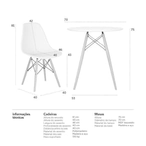 CADEIRAS: Material do assento: Polipropileno - Material da base: Madeira e aço - Altura do encosto: 81 cm - Altura do assento: 43 cm - Largura do assento: 46 cm - Profundidade do assento: 40 cm - Distância entre os pés: 40 cm - Peso suportado: 130 kg. MESA: Material do tampo: MDF laqueado (Laca fosca) - Material da base: Madeira e aço - Altura: 75 cm - Diâmetro: 70 cm.
