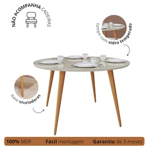 DIFERENCIAIS Design sofisticado: pés palito retrô combinados com tampo de vidro elegante Versátil: combina facilmente com estilos de decoração clássicos ou contemporâneos Compacta e funcional: ideal para otimizar espaços sem perder o conforto Fácil manutenção: tampo de vidro temperado de fácil limpeza e alta durabilidade