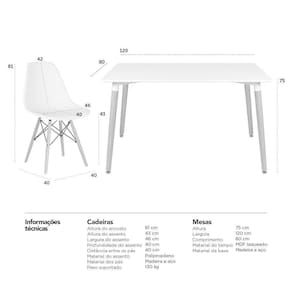 Fabricante: Mobili | RBN: 17100657011 | Altura: 75 cm | Cor: Multicolorido | Garantia do fabricante: 3 meses | Largura: 120 cm | Peso do produto: 15 kg | Produto: Conjunto de Mesa e Cadeiras | Quantidade de lugares: 4 | Material do tampo (mesa): MDF laqueado (Laca fosca) | Material da base (mesa): Madeira e aço | Altura (mesa): 75 cm | Largura x Comprimento (mesa): 120 x 80 cm | Material do assento (cadeiras): Polipropileno | Material da base (cadeiras): Madeira e aço | Altura do encosto (cadeiras): 81 cm | Altura do assento (cadeiras): 43 cm | Largura do assento (cadeiras): 46 cm | Profundidade do assento (cadeiras): 40 cm | Peso suportado (cadeiras): 130 kg