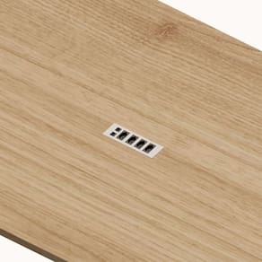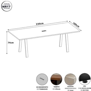 Mesa de reunião com espaço para até 8 pessoas, com estrutura firme e caixa de tomadas para conexão rápida de equipamentos. Solução inteligente e pronta para uso em ambientes corporativos modernos, como salas de reunião ou coworkings.