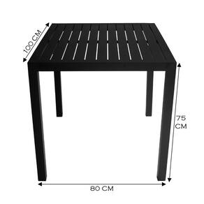 Produzida em aluminio com pintura eletrostatica preta fosca, e leve, moderna e totalmente resistente a maresia, sol e chuva, sem enferrujar. Seu tampo ripado, com ripas largas e espacamento sutil, traz um visual contemporaneo e funcional, permitindo o escoamento da agua e facilitando a limpeza.