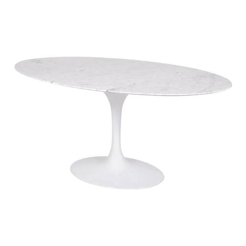 Esta versão se destaca pelo seu magnífico tampo oval em mármore carrara. A beleza do mármore Carrara é de tirar o fôlego: suas veias cinzentas sutis e intrincadas dançam elegantemente sobre um fundo branco imaculado, criando padrões naturais únicos que conferem uma profundidade e um luxo inigualáveis. Cada tampo é uma obra de arte natural, garantindo que sua mesa seja tão exclusiva quanto seu bom gosto.