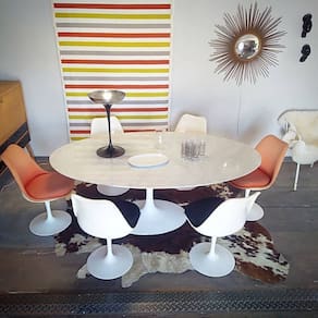 Mesa Saarinen Oval criada pelo Eero Saarinen. Foi projetada em 1956 como parte da icônica Coleção Pedestal, Saarinen procurou resolver a bagunça em casas e escritórios americanos criados por pernas de cadeiras e mesas convencionais, deixando assim um ambiente elegante e sofisticado.