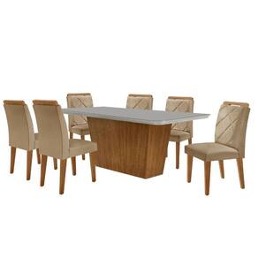 Mesa Sala De Jantar Aida 180cm E 6 Cadeiras Melissa Moderna Turim 07/off White/imbuia Com um design sofisticado e contemporaneo, a Sala de Jantar Aida com as Cadeiras Melissa e a escolha perfeita para elevar o ambiente que estiver. As cadeiras, com assentos e encostos estofados, sao adornadas com detalhes em bordados e alcas no encosto, conferindo um charme unico e refinado. A mesa complementa o conjunto com sua base robusta e linhas retas, apresentando um acabamento impecavel que destaca ainda mais a elegancia do espaco. Juntas, essas pecas transformam sua sala de jantar em um ambiente de beleza e estilo inigualaveis! Caracteristicas: Mesa e Cadeiras Tampo Canto Copo Tipo de Acabamento: Pintura UV Material da Estrutura: 100 MDF Possui Vidro: Sim